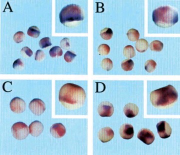 Fig. 7. Xcad-2 can regulate dorsal and ventral genes in dorsalized embryos. Embryos treated with LiCl were diagonally injected with either LacZ mRNA (A,C) or a combination of LacZ and Xcad-2 sense RNA (B,D). The treated embryos were probed during gastrula stages with the gsc (A,B) or the Xpo (C,D) probes. The gsc radial expression as a result of LiCl dorsalization (A) can be repressed by diagonal Xcad-2 injection (B). In the case of Xpo, LiCl treatment downregulates its expression (C) and Xcad-2 diagonal injection can restore expression of this gene (D). The blue color is the result of the in situ hybridization and the red color is the β-galactosidase lineage tracer. A panel with an enlarged embryo is shown.