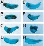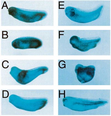 Fig. 8. Xcad-2 can reverse the effects of the dominant negative BMP receptor. Xenopus embryos were injected either ventrally at the 4-cell stage with RNA encoding for the dominant negative BMP receptor to induce secondary axis or radially to induce dorsalization. This RNA was co-injected with different mRNAs to test for the inhibition of secondary axis formation. (A,E) Control LacZ-injected embryo. (B) Embryo injected ventrally with a combination of Xcad-2 and LacZ RNAs. (C) Embryo injected ventrally with the dominant negative BMP receptor to induce secondary axes. (D) Embryo co-injected ventrally with Xcad-2 and dominant negative BMP receptor show inhibition of secondary axis formation. (F) Embryo injected radially with Xcad-2 mRNA. (G) Embryo injected radially with the dominant negative BMP receptor. (H) Embryo injected radially with Xcad-2 and dominant negative BMP receptor RNAs. All embryos were lineage traced with LacZ mRNA and stained with Xgal.