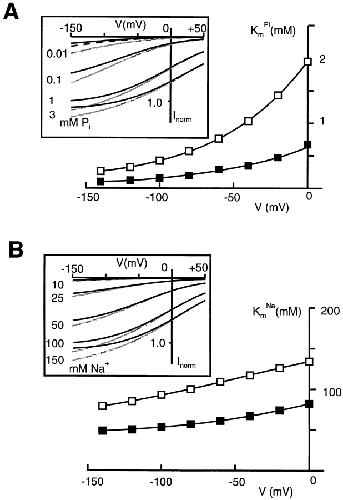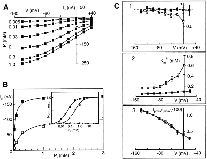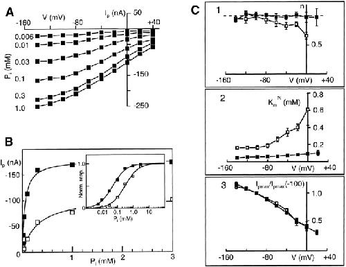 Figure 2. Steady state voltage dependency of Na+/Pi transport as a function of Pi. (A) Typical set of I-V curves obtained using staircase protocol (Fig. 1 B) applied to one cell with 96 mM Na+ and Pi in the range 0.006–1.0 mM as indicated. Data points are joined for visualization only. Note the absence of zero crossing for V > 0. (B) Representative dose-response curves at Vh = −50 mV for two concentrations of Na+: 96 (▪), 50 (□) mM and the same cell with Pi as the variable substrate. Eq. 1 was fit to the raw data with the following parameters: (96 mM Na+) KmPi = 0.054 mM, n = 0.8, Ipmax = 74 nA; and (50 mM Na+) KmPi = 0.27 mM, n = 0.9, Ipmax = 50 nA. Inset shows the same data normalized to maximum predicted response and plotted semi-logarithmically to indicate clearly the shift in KmPi. (C) Summary of voltage dependency of fitted parameters comparing data for two concentrations of Na+: 96 (▪) and 50 (□) mM pooled from different cells. Data are shown as mean ± SEM (N = 4). Only SEMs exceeding symbol size are shown. Data points are joined for visualization only. (C, 1) n = Hill coefficient, (dashed line) n = 1; (C, 2) KmPi = apparent affinity constant; (C, 3) Ipmax/Ipmax(−100) = maximum induced current normalized to the value at −100 mV. |