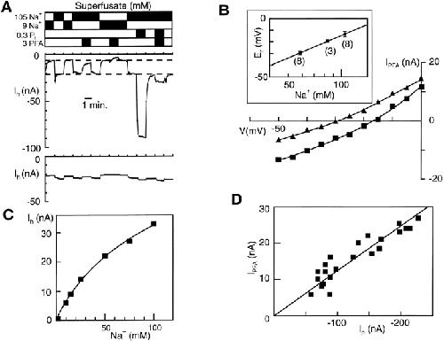 Figure 4. Characterization of Pi-independent current component using phosphonoformic acid. (A) Oocyte holding current (Ih) at Vh = −50 mV for continuous superfusion with the indicated solutions for a NaPi-2-expressing oocyte (top) and noninjected oocyte (bottom) from the same batch of oocytes and recorded during the same experimental session. Ih was sampled at 5-s intervals and the sample points have been joined by straight lines for clarity. Each superfusate combination was applied for 1 min to allow a stable baseline to be reached. Top and bottom dashed lines, superimposed on NaPi-2 data, indicate Ih at 9 and 105 mM Na+, respectively. (B) Typical I-V relations for the PFA-sensitive component at two concentrations of Na+: 109 (▪) and 59 (▴) mM. A staircase voltage protocol with 5-mV, 100-ms-long steps was applied to the oocyte. Points represent the difference between the steady state current at the end of each step under control conditions and the response in the presence of 3 mM PFA. As PFA is a trisodium salt, the control solution Na+ concentration in each case was adjusted to ensure that the Na+ gradient remained the same. Continuous lines are polynomial fits to the data, used to determine the reversal potential (Er). Inset shows Er plotted as a function of Na+ concentration. Note that Na+ concentration is plotted on a log10 scale. Number of cells is indicated for each Na+ tested. Straight line is a linear regression giving a slope 64.4 ± 1.7 mV. (C) Dose dependency with respect to Na+ for Ih in the absence of Pi at Vh = −50 mV. Data shown for a typical cell expressing NaPi-2. Each point represents the induced change in steady state current, relative to 0 mM Na+. Continuous curve is the fit using Eq. 1, giving Km = 128 mM, Ihmax = 74 nA, and n = 0.92. (D) The PFA-sensitive current correlates with the Pi-induced current. Data shown for 22 cells from several donor frogs displaying different levels of expression of NaPi-2. For each cell, the Pi-induced current (Ip) at 1 mM Pi was determined together with the PFA-sensitive component (IPFA) for 3 mM PFA at Vh = −50 mV. The straight line is a linear regression line forced through the origin with a slope: 0.126 ± 0.004. |