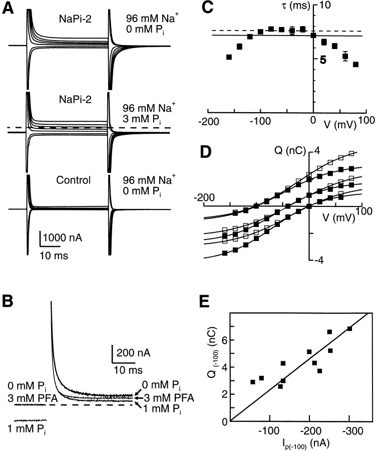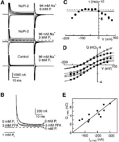Figure 5. Pre–steady state relaxations induced by voltage steps applied to oocytes expressing NaPi-2. (A) Family of current records in response to voltage steps from Vh = −100 to −140, −120, −80, −40, 0, +40, and +80 mV, and returning to Vh after 40 ms. (top) Superfusion with 96 mM Na+, 0 mM Pi. The endogenous capacitive charging transients of the oocyte have been clipped due to the high voltage clamp gain used. (middle) Superfusion with 96 mM Na+, 3 mM Pi. Dashed line, corresponding to the holding current level at −100 mV in the absence of Pi, is superimposed to indicate the change in steady state current induced by Pi (at −100 mV, Ip ≈ 250 nA). (bottom) Superfusion with 96 mM Na+, 0 mM Pi for a noninjected oocyte from the same batch. Each record is the average of eight successive raw sweeps. Filtering at 3 kHz, sampling 50 μs/point. (B) Effect of PFA pre–steady state currents. Records in response to a voltage step from −100 to 0 mV for superfusion in the presence of 0.3 mM Pi or 3 mM PFA compared with the response for 96 mM Na+ alone, as indicated. Dashed line indicates baseline for control condition. Each record is the average of eight successive raw sweeps and has been blanked for 2 ms during the capacitive charging transient. Filtering at 3 kHz, sampling 50 μs/point. (C) Voltage dependency of the main time constant (τ) obtained from biexponential fit to records such as in A for holding potentials (Vh) −100, −40, and 0 mV for the same cell. Filled symbols are mean ± SEM of the ON transition τs at the three Vh. The straight lines represent the mean of the OFF relaxation τs over the whole voltage range: (dotted line) Vh = −100 mV, (dashed line) Vh = 0 mV. The mean OFF τs are: 7.5 ± 0.06 ms (Vh = −100 mV); 7.6 ± 0.05 ms (Vh = −40 mV), and 7.13 ± 0.14 ms (Vh = 0 mV). (D) Voltage dependency of charge movement (Q) associated with NaPi-2-related component at different Vh for the same cell as in B. (▪) ON, (□) OFF. Continuous lines are fits of the Boltzmann function (Eq. 2) to the data. See Table I for fit parameters. (E) Correlation between estimated charge available for translocation at −100 mV (Q(−100)) and Pi-induced current at −100 mV (Ip(−100)) with 96 mM Na+ and 1 mM Pi. Data points are from 11 cells from different oocyte batches. Q(−100) was obtained by fitting the Boltzmann function (Eq. 2) to the Q-V data and Ip(−100) was obtained from steady state response of same cell under same recording conditions. Straight line is a linear regression line with slope 46 s−1 and forced to intercept the origin. |