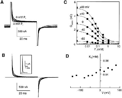 Figure 7. The effect of changing external Pi on pre–steady state relaxations. (A) Pre–steady state relaxations recorded from a cell expressing NaPi-2 for a voltage jump from −100 to 0 mV for 0, 0.01, 0.03, 0.06, 0.1, 0.3, 1, and 3.0 mM Pi. The initial baseline shift reflects the steady state holding current induced by each Pi. Pi was applied in increasing concentration. Between successive applications, the cell was allowed to recover in 0 mM Pi until the initial steady state holding current at −50 mV was reestablished. (B) The Pi-suppressed current obtained by subtracting the record at 3 mM Pi from the test record under the same voltage step conditions as A and same cell. Each trace has been baseline-adjusted to the steady state value. The first millisecond of each difference record during the voltage transition was blanked. This corresponds to the time to complete most of the oocyte capacitive charging as indicated in the inset for a voltage jump from −50 to −40 mV, plotted on the same time scale (same cell). (C) Pi dose response for the same cell showing amount of apparent charge suppressed (Qsuppr.) at −100 mV as a function of Pi for five target potentials as indicated. Charge was estimated by numerical integration of the records as in B, with the steady state holding current suppressed. A small error is expected in Qsuppr. due to starting the integration at 1 ms. Continuous lines show fits with Eq. 1 for n = −1. (D) Voltage dependence of apparent Kd for suppression of pre–steady state charge found from fitting Eq. 1 to the data, for the same cell as in C. |