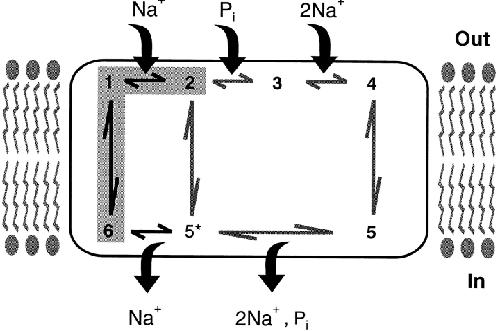 Figure 9. A state diagram representation of an ordered binding model for NaPi-2. Voltage-dependent partial reactions identified by pre–steady state experiments (translocation of the unloaded carrier, 6 ⇔ 1; binding of the first Na+, 1 ⇔ 2) are shown shaded. The empty cotransporter is assumed to have a valency of −1, but this charge translocates through a fraction of the transmembrane field to account for an apparent valency <1 derived from fits using Eq. 2. Both the slippage (2 ⇔ 5*) pathway and translocation of the fully loaded carrier (4 ⇔ 5) are assumed to be electroneutral. Depending on the availability of substrate and membrane potential, accessibility to the substrate binding sites favors either the cis (states 1, 2, 3, 4) or trans (states 5, 5*, 6) side of the membrane. Under normal physiological conditions with V < 0, the apparent transport cycle proceeds clockwise around the loop. For V < 0, and low internal Na+, external Na+ binding is facilitated on the cis side due to the outward translocation of −ve charge associated with transition 6 ⇔ 1. This allows one Na+ ion to move to its binding site within the transmembrane field, leading to an increasing of the affinity of the transporter for Pi (assumed to be predominantly divalent at neutral pH), which then binds (2 ⇔ 3) in a voltage-independent manner. Then follows a further voltage-independent step involving the binding of two Na+ ions (3 ⇔ 4) to give electroneutrality. The fully loaded carrier is now able to translocate (4 ⇔ 5), release substrates on the trans side, and return to state 6. A net inward charge movement of +1 electronic units occurs per cycle, which is manifested as Ip. Except for slippage, the order of binding/release of substrates on the cytosolic side cannot be determined using the intact oocyte preparation and, therefore, the cytosolic release of cotransported Pi, together with two Na+ ions, is lumped as one reaction (5 ⇔ 5*). |