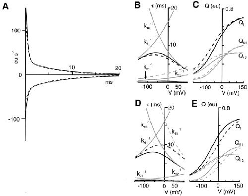 Figure 10. Simulations predict voltage-dependent behavior of pre–steady state kinetics in the absence of external Pi. Values were assigned to the parameters associated with voltage-dependent partial reactions (shown shaded in Fig. 9: unloaded carrier, 6 ⇔ 1; first Na+ binding/debinding, 1 ⇔ 2) to give a reasonable match to the measured τ-V and Q-V data under varying external Na+. (A) Simulations of pre–steady state current showing the ON and OFF relaxations for a step from −100 to 0 mV for two external Na+ concentrations (continuous lines, 100 mM; broken lines, 50 mM). The voltage step is assumed to occur instantaneously so that no account is taken of the speed of oocyte membrane charging. Note that because of the voltage dependence of k21, the fast component in the relaxation appears more prominent in the ON than OFF traces for both Na+, and this can lead to significant errors in estimating QON and QOFF (see discussion). Rate constants for voltage dependent steps are (s−1): k61 = 60 exp(−0.16 eV/kT), k16 = 120 exp(0.24 eV/kT), k12 = 8,000 [Na] exp(−0.15 eV/ kT), k21 = 2,000 exp(0.15 eV/kT), where [Na] = Na+ concentration (Molar). The corresponding valences and asymmetry factors are: z61 = 0.4, z12 = 0.5, δ61 = 0.4, δ12 = 0.5. Ordinate scale is in electronic units (eu) s−1, where 1 eu = 1.602 × 10−19 C. (B) Simulated τ-V relations for two external Na+ concentrations as in A. Bold curves represent the two nonzero time constants predicted from the eigenvalue solutions of the three-state model involving transitions 6 ⇔ 1 and 1 ⇔ 2 (continuous curves, 100 mM; broken curves, 50 mM). The faster component with τ < 1 ms would not be detected easily by curve fitting due to the oocyte charging transient. Light curves represent the voltage dependence of the reciprocal rate constants for the transitions indicated by the respective subscripts. Note that only k12 is dependent on Na+. (C) Simulated steady state Q-V relation for the same two Na+ concentrations. The amount of charge in electronic units contributed by the two transitions is shown (Q61, Q12), together with the total charge (Qt). For the simulation, the holding potential was set at −1,000 mV to obtain normalized relations. Fitting Eq. 2 to the Qt-V data predicted z = 0.5 and a shift of −16 mV for a change in Na+ from 100 to 50 mM. (D) Simulation of the effect of pH on pre–steady state kinetics. The unloaded carrier backward rate constant (K16) is assumed to be decreased from 120 to 60 s−1, resulting from an increase in external H+ as indicated by measurements. The τ-V curves predict an increase of the slower relaxation for V > 0. Continuous lines represent τs (bold) and inverse rate constants (light) under normal (pH 7.4) conditions. Broken lines are for reduced pH conditions. (E) The corresponding steady state Q-V relations for the same change in rate constant K16 showing the shift in the Q-V distribution towards depolarizing potentials (broken lines) resulting primarily from a shift in the steady state charge distribution of the unloaded carrier. |