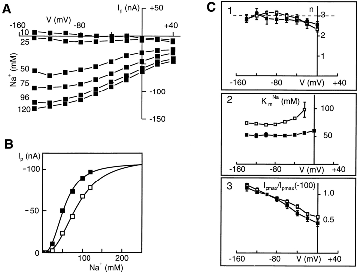 Figure 3. Steady state voltage dependency of Na+/Pi transport as a function of Na+ concentration. (A) Typical family of I-V curves obtained from one cell with 1 mM Pi and six Na+ concentrations as indicated (millimolar). Data points are joined for visualization only. (B) Typical dose-response data for the same cell at two Pi concentrations: 1.0 (▪) and 0.1 (□) mM with Na+ as the variable substrate and Vh = −50 mV. Eq. 1 was fit to the data points. For this cell, the fit parameters were: (1 mM Pi) KmNa = 50.1 mM, n = 2.6, Ipmax = 109 mM; and (0.1 mM Pi) KmNa = 89 mM, n = 2.6, Ipmax = 114 mM. (C) Summary of voltage dependence of fitted parameters comparing data for two concentrations of Pi: 1 (▪) and 0.1 (□) mM. Data are shown as mean ± SEM. Only SEMs exceeding symbol size are shown. Data points are joined for visualization only. (C, 1) n = Hill coefficient, (dashed line) n = 3; (C, 2) KmNa = apparent affinity constant; (C, 3) Ipmax/Ipmax(−100) = maximum induced current normalized to the value at −100 mV. |