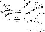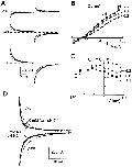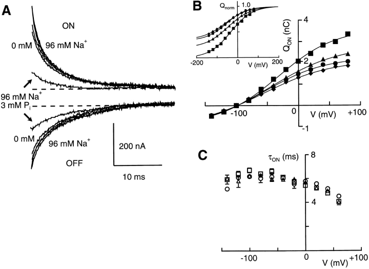 Figure 6. The effect of changing external Na+ on pre–steady state relaxations. (A) Typical response to a voltage step from −100 to 0 mV for a cell expressing NaPi-2 (Ip = −120 nA at −50 mV, 3 mM Pi). The cell was superfused with 96, 50, 25, and 0 mM Na+ and sufficient time was allowed between changing superfusate to establish a steady holding current before making pre–steady state recordings. The pre–steady state response to superfusion with 96 mM Na+ and 3 mM Pi is also shown. For superfusion with 0 mM Na+ and 3 mM Pi, the response was the same as for 0 mM Na+ alone (data not shown). All traces were blanked for the first 2 ms after the step and adjusted to give the same steady state baseline. (B) Steady state charge distribution under varying Na+. The Q-V data (ON transition) for a typical cell with superfusion with 96 (▪), 50 (▴), 25 (•), and 10 (♦) mM Na+. Continuous lines were obtained by fitting the Boltzmann function (Eq. 2) to the data. Inset shows the same data normalized to the predicted maximum charge and offset to superimpose at the depolarizing limit to indicate the shift in V0.5. (C) τ-V data pooled (n = 4) showing main ON relaxation time constant determined for superfusion with 96 (□), 50 (▵), and 25 (○) mM Na+. |