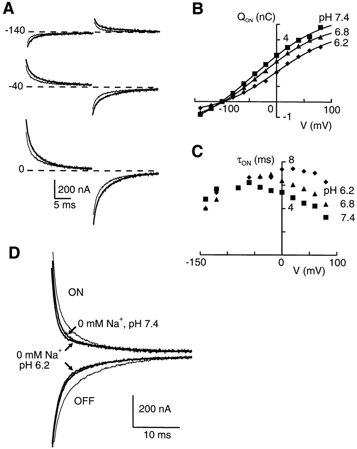 Figure 8. The effect of external pH on pre–steady state relaxations. (A) Superimposed pre–steady state relaxations for ON and OFF voltage steps to the test potentials indicated from a holding potential of −100 mV for the same cell with 96 mM Na+ in external medium. Thick traces, pH 7.4; thin traces, pH 6.2. To suppress the endogenous capacitive transient, the records were blanked for the first 3 ms after the transition. (B) Apparent charge movement for three pHs indicated in the presence of 96 mM Na+. Continuous lines are fits using the Boltzmann function (Eq. 2). The fit parameters were: (pH 7.4) z = 0.38, V0.5 = −40 mV, Qmax = 7.4 nC; (pH 6.8) z = 0.37, V0.5 = −23 mV, Qmax = 7.5 nC; (pH 6.2) z = 0.46, V0.5 = −2 mV, Qmax = 5.3 nC. (C) Voltage dependence of main ON relaxation τ for three pHs indicated and the same cell as in B. (D) Pre–steady state relaxations recorded from another cell for a step from −100 to 0 mV (ON) and returning to −100 mV (OFF) for three superfusion conditions: 96 mM Na+, pH 7.4 (thin trace); 0 mM Na+, pH 7.4, and 0 mM Na+, pH 6.2 (arrows). The graphical superposition of the traces reveals that after removal of Na+ from the external medium, a reduction in pH leads to a further suppression of the relaxations. To suppress the endogenous capacitive transient, the records are blanked for the first 3 ms after the transition. |