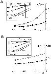 Figure 11. Simulations of Pi-induced currents in the steady state, assuming zero trans conditions. Since the transition 6 ⇔ 1 is the only translocation step involving net charge movement, the steady state current is proportional to X1k16 − X6k61, where X1 and X6 are the occupancy of states 1 and 6, respectively. Voltage-dependent rate constants and parameters are given in Fig. 10. Additional rate constants for the kinetic scheme of Fig. 9 are (s−1): k23 = 1,000 [Pi], k32 = 100, k34 = 500 [Na]2, k43 = 50, k45 = k54 = 25, k55* = 10,000, k5*5 = 0, k5*6 = 10,000, k65* = 0, k25* = 2.5, k5*2 = 2.5, where [Pi] and [Na] are the concentrations of Pi and Na+, respectively (Molar). These were chosen to give reasonable predictions of the experimentally observed I-V relations. (A) Pi dose response. Inset shows a set of I-V curves for nominal Pi values indicated, normalized to Ip at −100 mV. Dashed curve is the slippage component (simulated with Pi = 0 mM), light curves represent the total simulated Pi-induced steady state current and bold curves represent the steady state response with slippage component subtracted (equivalent to the Pi-induced response measured). Eq. 1 was fit to the data to obtain the apparent KmPi as a function of V for nominal 100 (▪) and 50 (□) mM Na+. The continuous lines are for visualization only. (B) Na+ dose response. (inset) Set of I-V curves for nominal Na+ values indicated, and 1 mM nominal Pi, normalized to Ip at −100 mV. Light curves represent the simulated total steady state current, bold curves have slippage component subtracted (equivalent to the Pi-induced response measured). Eq. 1 was fit to the data to derive the apparent KmNa as a function of V for nominal 1 (▪) and 0.1 (□) mM Pi. The continuous lines are for visualization only. |