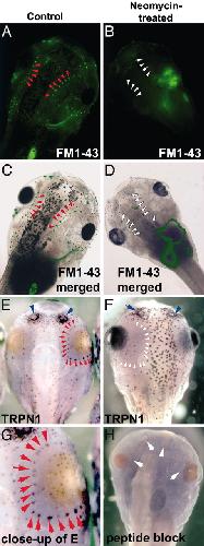 Fig. 1. Localization of TRPN1 in lateral-line hair cells of stage-45 Xenopus embryos. (A and B) Dissecting microscope dorsal view of embryos that had been stained with FM1-43 to label lateral-line hair cells. In A, red arrows point to lateral-line hair cells around the eye; in B, white arrows highlight the absence of FM1-43 staining around the eyes of neomycin-treated embryos. (C and D) Shown are A and B merged with their respective transmitted light images to better show the localization of FM1-43 staining. (E) Staining with the anti-TRPN1 antibody. Dorsal view of an embryo that had been bleached to distinguish alkaline phosphatase staining from pigment. Red arrows point to staining of the lateral-line stitches around the eye. Blue arrows point to staining of the nostrils. (F) Anti-TRPN1 staining of unbleached, neomycin-treated embryo. Nostrils are positive for TRPN1, but staining around the eyes is absent, showing that the neomycin effect is specific to lateral-line hair cells. (G) Close-up of the lateral-line staining surrounding the eye shown in E. Red arrows point to signal in lateral-line stitches. (H) Dorsal view of bleached embryo. Preadsorption of the TRPN1 antibody with the epitope peptide prevented TRPN1 staining of both the lateral line and the nostril (white arrows). |