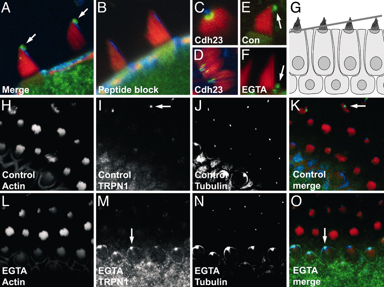Localization of TRPN1 in Xenopus vestibular hair cells. (A) Saccular hair cells in profile. Triple staining for TRPN1 (green), actin (red), and tubulin (blue); pseudocolor code also applies to B, E, F, K, and O. Arrows indicate TRPN1 at the kinocilial bulb. (B) Preincubation of the TRPN1 antibody with the epitope peptide prevents TRPN1 staining at the kinocilia tip. (C and D) Cdh23 (green), actin (red), and tubulin (blue) in hair cell under control conditions. Cdh23 is present in the two to six tallest stereocilia in a stripe adjacent to the kinocilial bulb. (E) TRPN1 and actin in hair cell under control conditions. Note TRPN1 in kinocilia bulb (arrow). (F) After EGTA treatment (5 mM, 30 min), the TRPN1 signal appears at the base of the kinocilium (arrow). (G) Graphic illustration of the optical section in the confocal sections of H-O. (H-O) Whole-mount view of hair bundles, in a slightly angular optical section as illustrated in G. (H-K) Control conditions. (H) Actin. (I) TRPN1. (J) Tubulin. (K) Merged signals. (L-O) After EGTA treatment. (L) Actin. (M) TRPN1. (N) Tubulin. (O) Merged signals. Full panel widths: 24 μm, A and B; 8 μm, C; 25 μm, D; 13 μm, E and F; 45 μm, H-O. |