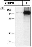 Fig. 6. Immunoblot analysis of xlTRPN1. Immunoblot with the antibody against the C terminus of xlTRPN1. Left lane, uninjected oocytes. Right lane, oocytes injected with cRNA coding for full-length xlTRPN1 (two oocytes per lane). Note the presence of xlTRPN1 in uninjected oocytes. |