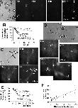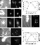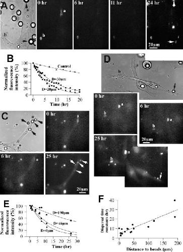 Figure 2. Dispersal of AChR hot spots as a function of distance to its nearest bead-induced new cluster. (A) Two hot spots at positions a and b underwent dispersal in response to bead-induced new cluster formation. The arrows point to two bead-induced clusters which were nearest to these two spots. Hot spot a is closer to a developing bead-induced cluster (top arrow) than hot spot b (bottom arrow). As the time sequence shows, a is dispersed at a much faster rate than b. The image at 24 h was contrast-enhanced to illustrate the bead-induced cluster (arrows). The same is true of the last time point in C and D. (B) Quantification of hot spot dispersal. Two hot spots on the same cell, one at a distance of 20 μm (squares) and the other at 30 μm (circles) away from its nearest bead-induced cluster, were recorded throughout the dispersal process. Triangles were measurements of a hot spot from a control cell not treated with beads. Points of each dispersal process can be well fitted with a simple exponential decay curve: I(t) = I0e−t/τ, where I(t) and I0 are intensities at time t and 0, respectively, and τ is the time constant. This allows the calculation of the dispersal time constant. (C) A hot spot (a) immediately underneath a bead. It underwent dispersal quickly while new clusters formed under beads (arrows). (D) A hot spot (b) at a long distance (190 μm) from the closest bead. It showed very slow decrease in R-BTX fluorescence. Its intensity at 25 h was not much different from a control cluster (a). (E) Rate of dispersal of the two hot spots depicted in C (D = 0 mm) and D (D = 190 mm). The intermediate hot spot is from another cell. (F) Time constants of hot spot dispersal as a function of distance to nearest bead-induced AChR cluster. Each dot represents a single hot spot. Data were collected from 12 cells. A linear regression line is drawn through the data points. The correlation is highly significant with a correlation coefficient of 0.87 (P < 0.0001, Pearson product moment correlation test).