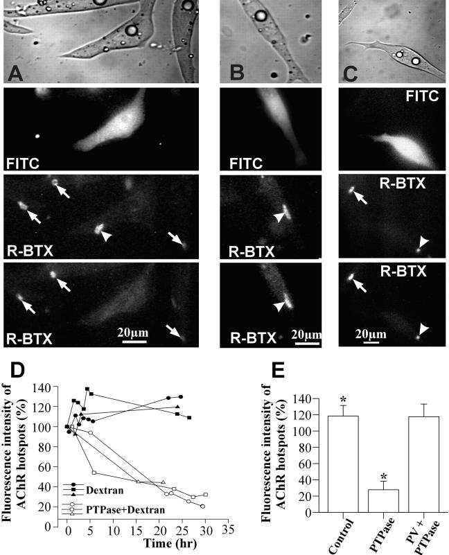 Figure 5. Effect of PTPase injection on cluster dispersal. (A) PTPase and FITC-dextran injection. The cell in the middle was injected with Yersinia PTPase together with FITC-dextran. Before injection, all cells in the field had AChR hot spots (arrows and two-tailed arrowhead in the top R-BTX panel). 24 h after PTPase injection (bottom R-BTX panel), the hot spot disappeared on the PTPase- injected cell, while they persisted on uninjected cells (arrows). (B) Control FITC-dextran injection. The hot spot on dextran-injected cell was unaffected 24 h after injection. (C) PTPase and FITC-dextran injection in the presence of PV (75 μM). The hot spot on the injected cell remained intact (two-tailed arrowheads). (D) Time course of hot spot dispersal resulting from direct PTPase injection compared with control cells. (E) Ratio of mean fluorescence intensity of AChR hot spots at 24 h after injection over its original state. Control (FITC-dextran), n (number of cells) = 11; PTPase, n = 11; PV+PTPase, n = 3. The difference between control and PTPase is highly statistically significant (P < 0.001).