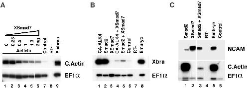 (lane 1, C). These inductions are efficiently inhibited by coinjections of 2 ng of XSmad7 RNA (lanes 4 and 5, B; and lane 3, C). |