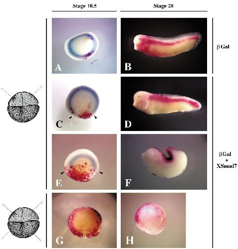 XSmad7/b-Gal dorsal injections (C), ventral expression of XSmad7 or XSmad7/b-Gal RNA induced ectopic secondary axes in embryos (D,
