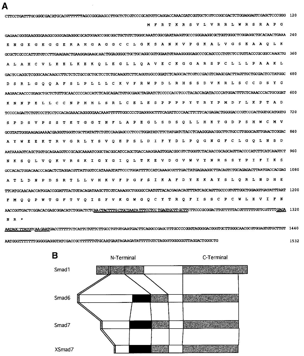 FIG. 1. Structure of XSmad7. (A) Nucleotide and deduced amino acid sequence of XSmad7. The underlined nucleotides are identical to