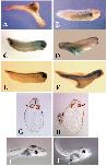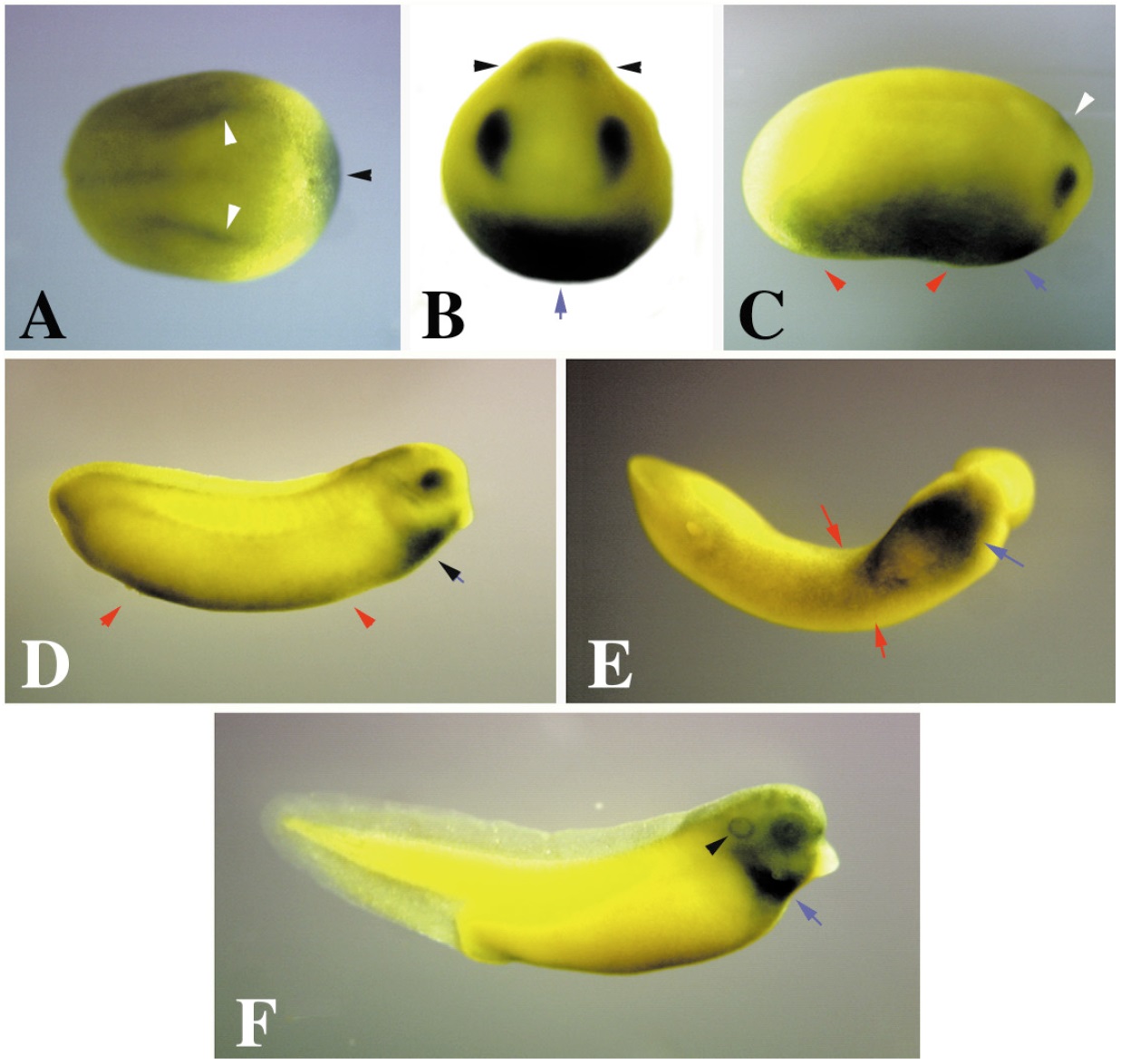 maintained (blue arrow in E). D is a side view and E is a ventral view. At tadpole stages (F), the strongest levels of expression remain in the