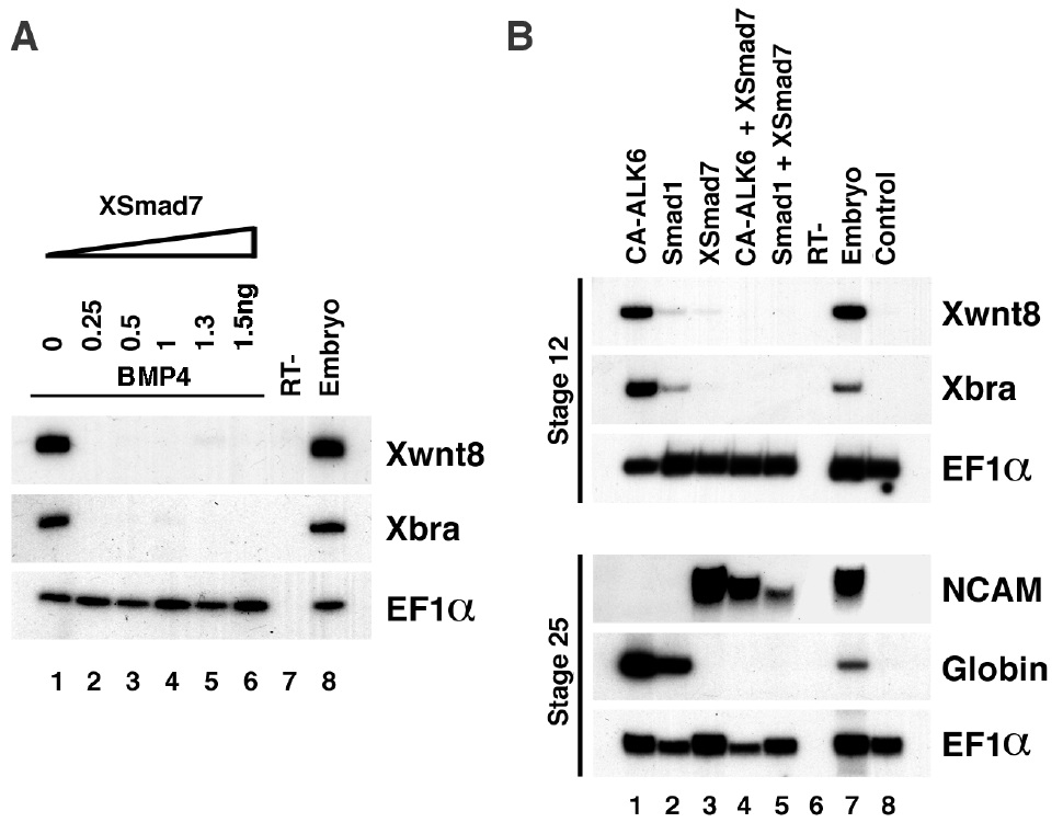 primers. Although BMP4 alone is able to induce these markers (lane 1), in the presence of as low as 0.25 ng of XSmad7, this induction is