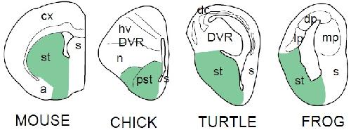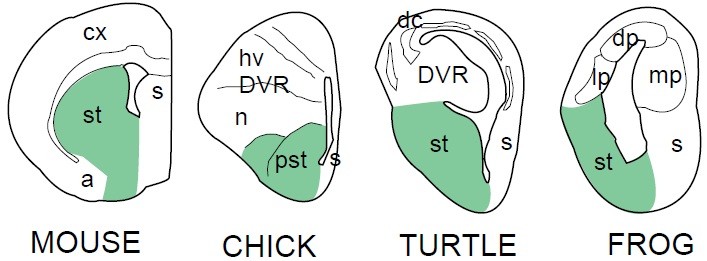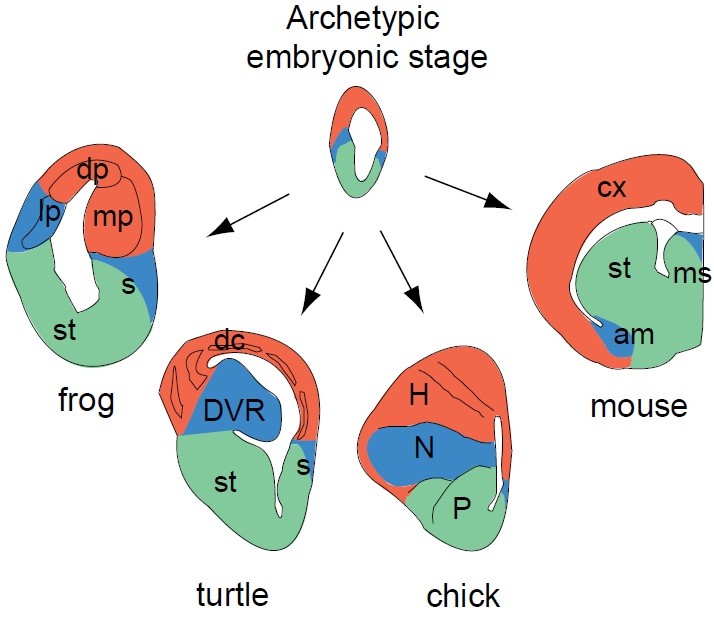 Expression of the Emx-1 and Dlx-1 homeobox genes define three molecularly distinct domains in the telencephalon of mouse, chick, turtle and frog embryos: implications for the evolution of telencephalic subdivisions in amniotes.