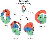 Homologies between vertebrate forebrain subdivisions are still uncertain. In particular the identification of homologs of the mammalian neocortex or the dorsal ventricular ridge (DVR) of birds and reptiles is still a matter of dispute. To get insight about the organization of the primordia of the main telencephalic subdivisions along the anteroposterior axis of the neural tube, a fate map of the dorsal prosencephalon was obtained in avian chimeras at the 8- to 9-somite stage. At this stage, the primordia of the pallium, DVR and striatum were located on the dorsal aspect of the prosencephalon and ordered caudorostrally along the longitudinal axis of the brain. Expression of homeobox-containing genes of the Emx, Dlx and Pax families were used as markers of anteroposterior developmental subdivisions of the forebrain in mouse, chick, turtle and frog. Their expression domains delineated three main telencephalic subdivisions in all species at the onset of neurogenesis: the pallial, intermediate and striatal neuroepithelial domains. The fate of the intermediate subdivisions diverged, however, between species at later stages of development. Homologies between forebrain subdivisions are proposed based on the conservation and divergence of these gene expression patterns.