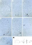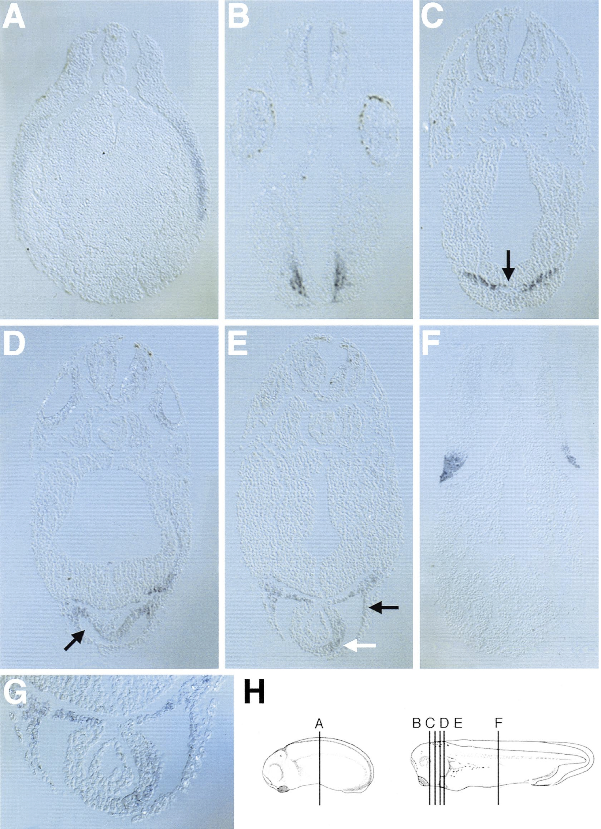 Fig. 4. Transverse sections of embryos processed for RNA whole-mount in situ hybridisation using a probe specific for XeHAND. The positions of the sections are indicated in (H). Sections are viewed from an anterior prospect. (A) At early tailbud stages (stage 25), XeHAND is expressed in the lateralmesoderm. (B) At tadpole stages (stage 33/34), XeHAND is expressed in two patches in the head mesenchyme, on either side of the foregut. (C) Moving towards the posterior, the two patches of expression flatten on either side of the ventral aorta lumen (black arrow). (D) At the level of the anterior of the pericardial cavity, XeHAND can be detected throughout the dorsal pericardium (pericardial cavity indicated by a black arrow). (E) Sections through the middle of the heart tube show XeHAND expression throughout the pericardium, including the inner wall (black arrow), as well as in the left side of the myocardial tube (white arrow). (G) A close-up of the section shown in (E). (F) Sections at the level of the flank staining show that XeHAND is expressed in the presumptive posterior cardinal veins, ventral to the somites.