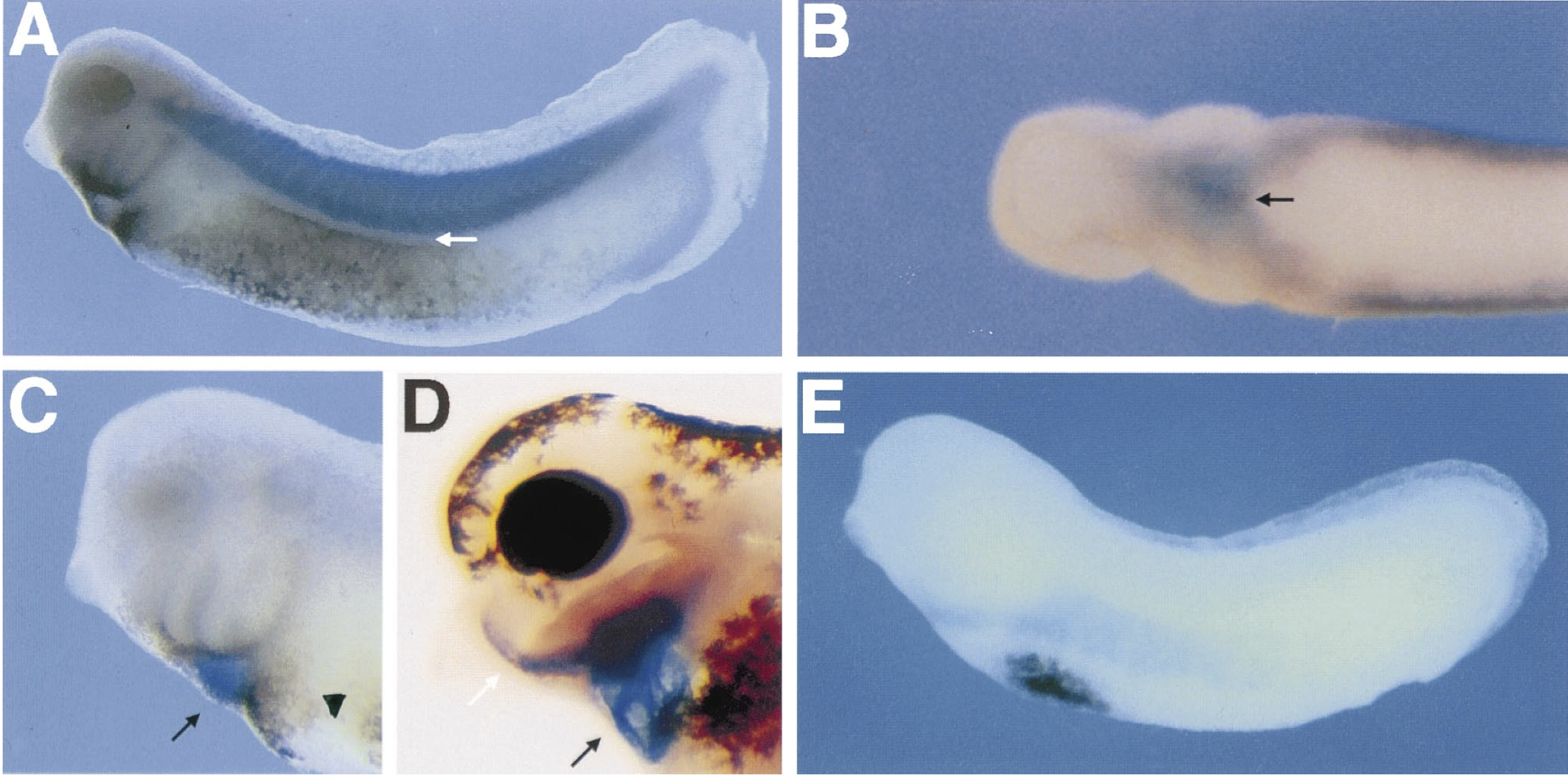 Fig. 5. Double-labelled in situ hybridisation analysis of XeHAND expression. (A) Late tailbudembryo (stage 31), lateral view showing staining for MLC113 (blue) and XeHAND (reddish-brown). Note the distinct gap between the bottom of the somites, and the domain of XeHAND expression (white arrow). (B) Tailbud (stage 28) embryo, ventral view showing staining for XMLC2a (light blue) and XeHAND (purple). Note the thin line of XeHAND expression dividing the two patches of XMLC2a (black arrow). (C) Lateral view of a swimming tadpole (stage 31) showing staining for XMLC2a (light blue; black arrow) and XeHAND (reddish-brown). The arrowhead indicates that portion of the ventral surface that is not covered by mesoderm. (D) Feeding tadpole (stage 40) lateral view showing staining for XMLC2a (light blue) and XeHAND (purple). XMLC2a staining in the heart is indicated by a black arrow, and XeHAND staining in the ventral aorta and first aortic arches are indicated by the white arrow. The embryo was cleared with BB/BA. (E) Lateral view of a tailbudembryo (stage 27) stained for T4 a-globin (purple) and XeHAND (light blue).