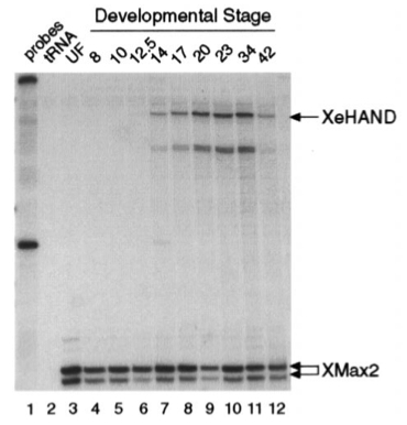 Fig. 2. Expression of XeHAND in Xenopus embryos. The distribution of XeHAND transcripts was analysed by RNase protection assay. Lane 1, undigested probes; lane 2, tRNA control; lanes 3â12, unfertilised oocyte, stages 8, 10, 12.5, 14, 17, 20, 23, 34, 42 embryo RNA, respectively. Two embryo equivalents of RNA (10 mg) was used in each case. Full-length protected fragments for each probe are indicated. As an internal control, a probe for XMax2 (which is expressed at constant levels throughout early development (Tonissen and Krieg, 1994)) was included in the XeHAND assay.