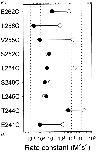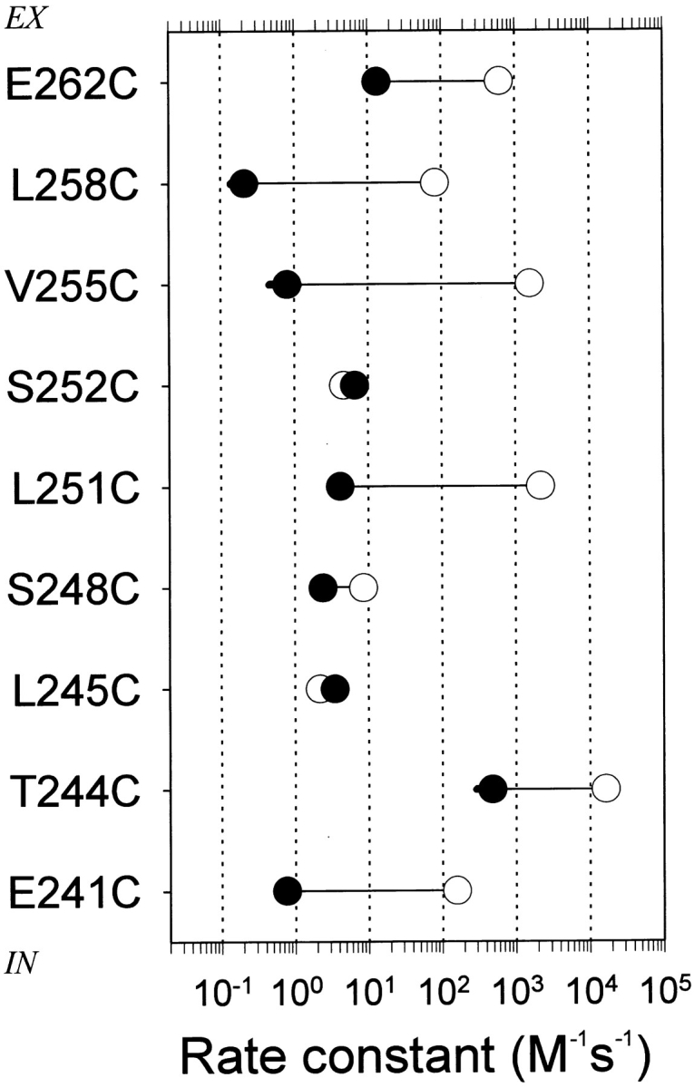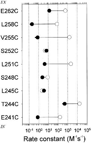 Figure 2. Rate constants for the reaction of MTSEA with substituted Cys mutants in the absence (•) and presence (○) of ACh. When reagent was added with ACh, the ACh concentration was 10× the EC50 for the mutant. The protocols are given in methods. MTSEA concentrations ranged from 2.5 μM to 5 mM. Horizontal lines connect the mean rate constants in the two conditions. Each symbol is the mean of three to seven independent determinations. Thick lines represent the SEM where it extends beyond the symbol. The holding potential was −50 mV. |