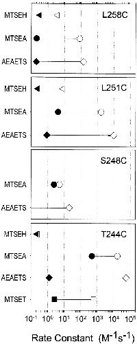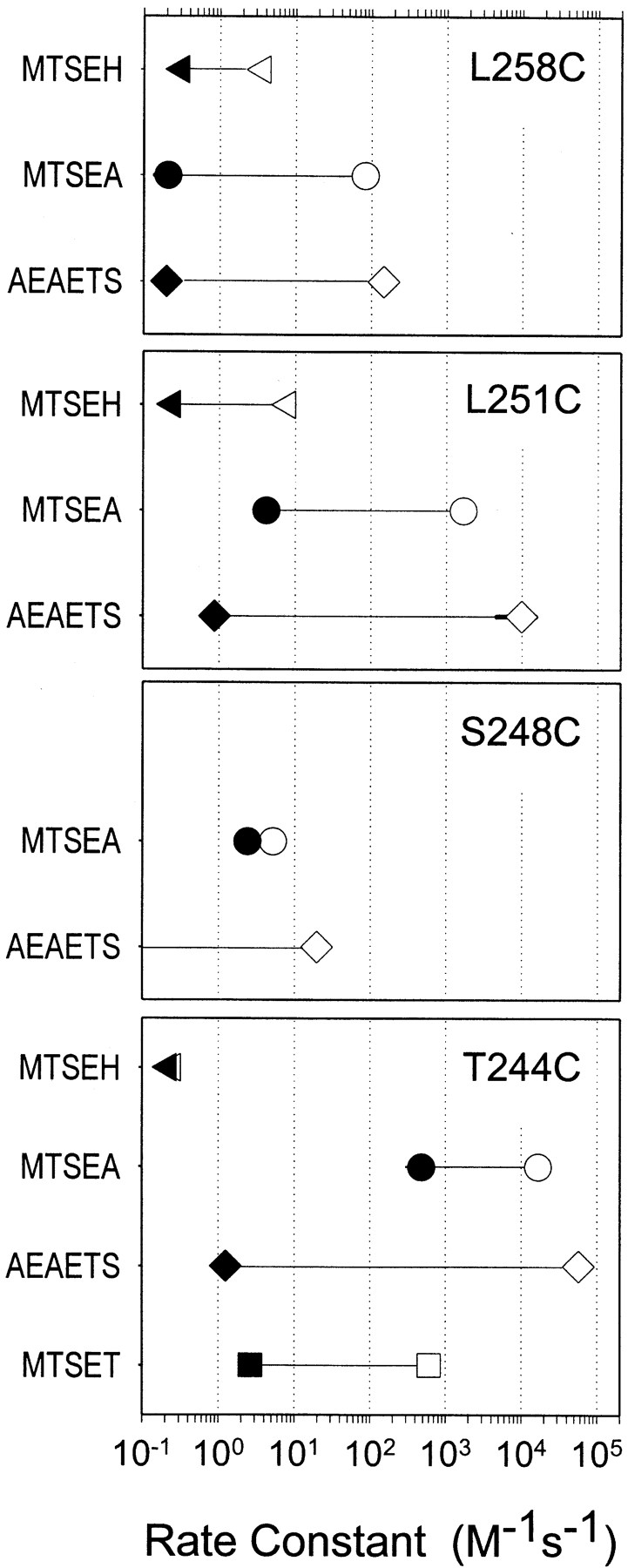 Figure 3. Comparison of the rate constants for the reactions of AEAETS (diamonds), MTSEA (circles), MTSET (squares), and MTSEH (triangles) with substituted Cys mutants in the absence (filled symbols) and presence (open symbols) of ACh. Thick lines indicate the SEMs of the rate constants where larger than the symbol. The reactions of MTSET and MTSEH with αS248C, both in the presence and absence of ACh, were undetectable. For αL258C, the rate constant for the reaction with AEAETS in the absence of ACh is an upper limit because AEAETS induced some current. The holding potential was −50 mV. Each symbol is the average of two to seven independent measurements. |