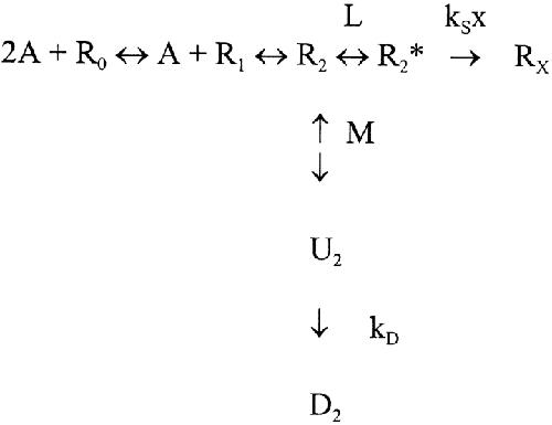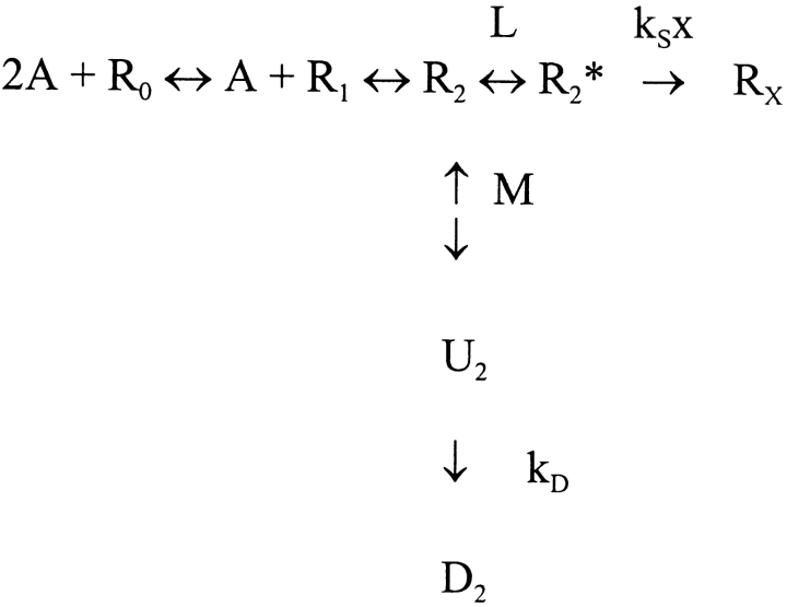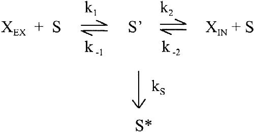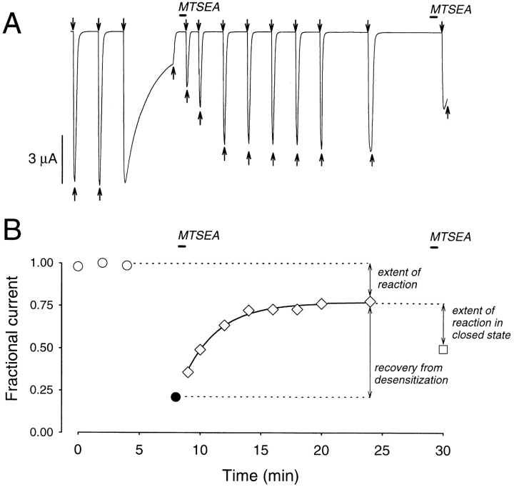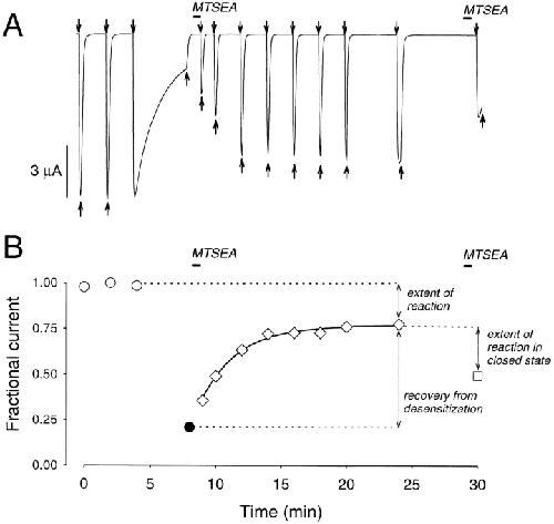 Figure 4. Reaction of αT244C in the desensitized state. (A) Experimental protocol for determining the extent of MTSEA reaction with αT244C in the desensitized state. Applications of 60 μM ACh are indicated by downward arrows, of bath solution by upward arrows, and 85 μM MTSEA by horizontal bars. The time scale is given as the abscissa in B. Two initial responses elicited by 10-s applications of ACh were followed by a 4-min application of ACh, during which the current declined to 20% of its peak value by desensitization. Bath solution was applied for 15 s, and then MTSEA was applied for 30 s. After a 15-s wash, ACh was reapplied several times and the responses increased as the receptors recovered from desensitization. MTSEA was applied again for 30 s to the receptors in the resting state, and the effect of this application was assayed by a final application of ACh. The holding potential was −50 mV. (B) The inhibition, 1 − It/I0, due to both desensitization and the reaction of MTSEA is plotted as a function of the recording time, corresponding to the experiment in A. The recovery from desensitization was fit by a single exponential function with a time constant of 106 ± 27 s (n = 5), characteristic of the mutant αT244C. |
