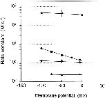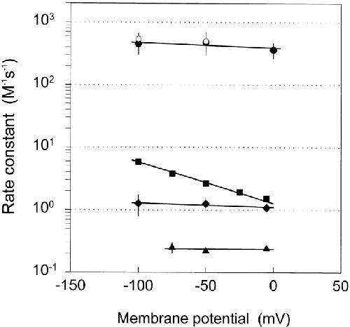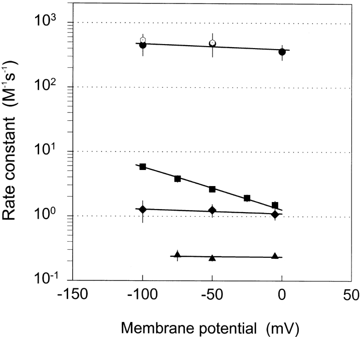 Figure 5. Rate constants for the reactions of thiosulfonate derivatives with αT244C in the absence of ACh as a function of membrane potential. Second-order rate constants for reactions with AEAETS (filled diamonds), MTSEA (filled circles), MTSEA at pH 6.5 (unfilled hexagons with dot), MTSET (filled squares), and MTSEH (filled triangles) are shown as a function of membrane potential. Nonlinear-least-squares fit of the data by Eq. 7 yielded the following parameters (parameters without errors were assumed): for MTSEA, C = 390 ± 55, D = 0, zδ = 0.05 ± 0.05; for AEAETS, C = 1.10 ± 0.06, D = 0, zδ = 0.040 ± 0.021; for MTSET, C = 1.28 ± 0.08, D = 0.01, zδ = 0.40 ± 0.02. These parameters were used to generate the curves. For MTSEH, for which z = 0, a line of zero slope was drawn at the mean κ. |