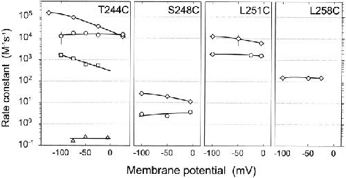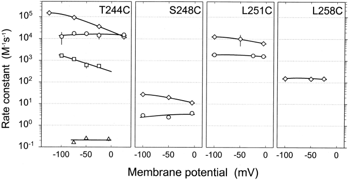 Figure 6. Rate constants for the reactions of Cys-substituted mutants in the presence of ACh with AEAETS (⋄), MTSEA (○), MTSET (□), and MTSEH (▵) as a function of membrane potential. Means and SEM for three to seven determinations are shown. Nonlinear least squares fit of the data by Eq. 7 yielded the following parameters (parameters without errors were assumed), which were used to generate the curves: for αT244C and MTSEA, C = 46,900 ± 4,190, D = 2, zδ = 0.38 ± 0.04; for αT244C and AEAETS, C = 21,200 ± 410, D = 0.007 ± 0.0004, zδ = 0.54 ± 0.009; for αT244C and MTSET, C = 307 ± 60, D = 0.01, zδ = 0.44 ± 0.06; for αS248C and MTSEA, C = 6.6 ± 1.8, D = 1, zδ = 0.28 ± 0.12; for αS248C and AEAETS, C = 11 ± 0.5, D = 0.007, zδ = 0.31 ± 0.02; for αL251C and MTSEA, C = 1,680 ± 16, D = 0.09 ± 0.003, zδ = 0.15; for αL251C and AEAETS, C = 6,060 ± 270, D = 0.007, zδ = 0.26 ± 0.01; for αL258C and AEAETS, C = 131 ± 130, D = 0.007, zδ = 0.12 ± 0.04. For αT244C and MTSEH, z = 0, and the overall mean of the mean κ at the three ψM, 0.21 ± 0.05, is plotted with zero slope. |