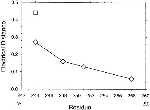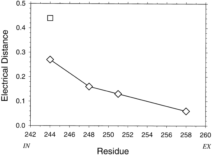 Figure 7. Electrical distance, δ, from the extracellular medium to the probed Cys, determined in the presence of ACh. The δ were obtained from the fits in Fig. 6, assuming z = 1 for MTSET (□) and z = 2 for AEAETS (⋄). |