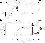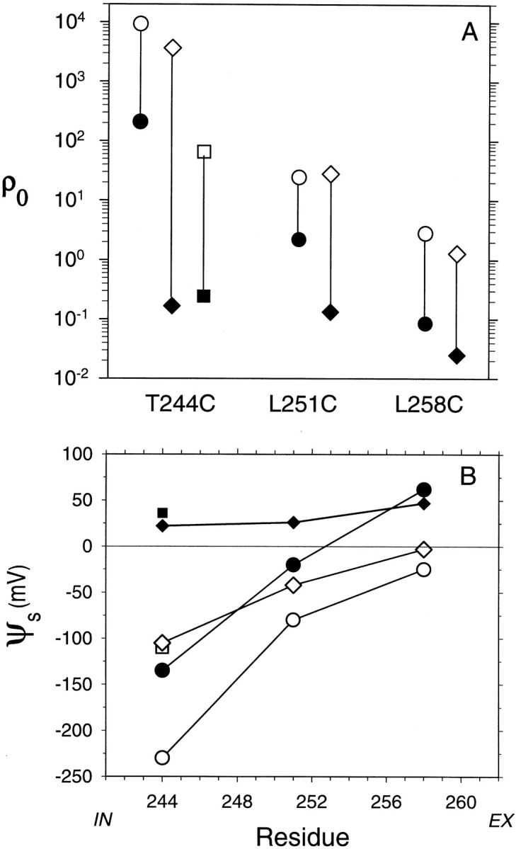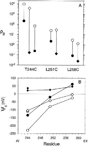 Figure 8. The relative rates of reaction and the intrinsic electrostatic potential in the channel at αT244C, αL251C, and αL258C. (A) The rate constants for the reactions of MTSEA (circles), AEAETS (diamonds), and MTSET (squares) with substituted Cys in αM2 were determined at various membrane potentials (Fig. 6), and the rate constants at zero membrane potential was determined by interpolation or extrapolation. Filled symbols are for reactions in the absence of ACh and open symbols are for reactions in the presence of ACh. These rate constants were divided by the rate constants for the reactions of MTSEH with the same substituted Cys, to obtain relative rates of reaction with the Cys in the channel. Also, the rate constants for the reactions of each of the charged thiosulfonates with 2-mercaptoethanol in solution was divided by the rate constant for the reaction of MTSEH with 2-mercaptoethanol to obtain relative rates of reaction with a simple thiol in solution. The relative rate constants for the reactions with receptor were divided by the relative rate constants for the reactions with 2-mercaptoethanol to obtain ρ0 for each mutant and reactant, both in the presence and absence of ACh. (B) The intrinsic potentials, ψS, were calculated from Eq. 10. Symbols are as in A. |