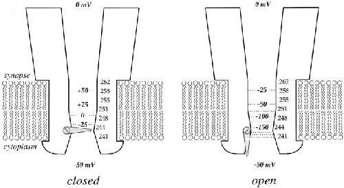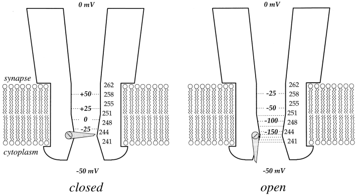 Figure 9. Scheme of the electrostatics and the gate of the ACh receptor channel in the open and closed states. The sum of δψM + ψS is indicated by a contour plot through the channel with equipotentials every 25 mV. For the open state, δ is from Fig. 7, ψM = −50 mV, ψS is the average of the values at each residue in Fig. 8 B; for the closed state, δ = 0 and ψS are the average of the values in Fig. 8 B. In the open state, δψM + ψS extrapolates to ∼−250 mV at αE241, the last contour shown. |