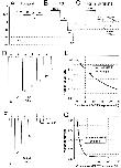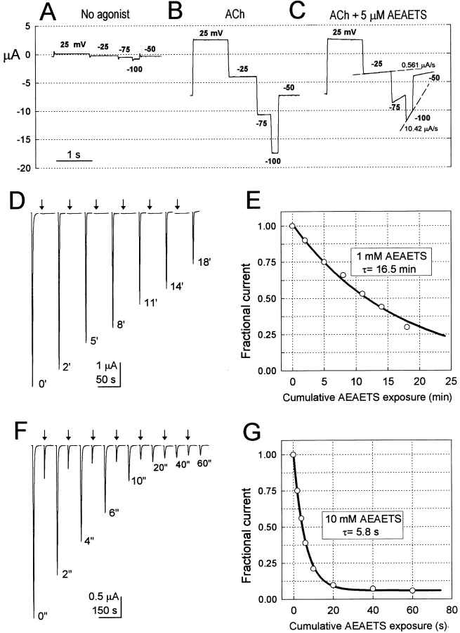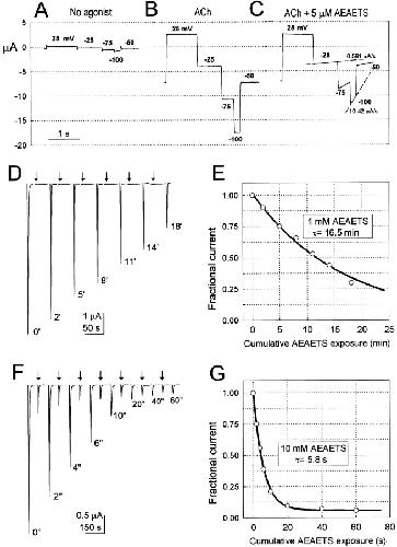Figure 1. Determination of the rate constants for the reactions of thiosulfonates with substituted cysteines. (AâC) Reaction of AEAETS with αT244C in the presence of ACh. (A) Current recorded in the absence of ACh while clamping an oocyte expressing αT244C receptor to 25 mV for 1 s, â25 mV for 0.8 s, â75 mV for 0.4 s, and â50 mV for 0.25 s. (B) Currents induced by 60 μM ACh under the same voltage protocol as in A. (C) Currents in the presence of 5 μM AEAETS plus 60 μM ACh under the same voltage protocol as in A. Reagent and ACh were added before the start of the first voltage step. The time course of inhibition was approximately linear, and the pseudo-first order reaction rate constant at each voltage was estimated by the slope divided by the current amplitude at the beginning of each voltage interval. Linear fits and slope values are shown for the reactions at â25 and â100 mV. The records in AâC were obtained from the same cell. (DâE) Reaction of AEAETS with αT244C in the absence of ACh. (D) ACh-induced currents before and after applications of 1 mM AEAETS in the absence of ACh. The following sequence of applications was repeated five times: 60 μM ACh for 10 s, wash 4 min, AEAETS for 2â4 min (beginning at arrows), and wash 3 min; ACh was applied for 10 s to obtain the final response. The cumulative duration of exposure to AEAETS before each ACh-induced response is indicated next to the peak of current. The clamp potential was â50 mV. (E) Peak ACh-induced currents in D (â), normalized to the initial ACh- induced current, plotted against the cumulative time of exposure to AEAETS. The solid line is a single exponential fit (see methods). (FâG) Reaction of 10 mM AEAETS with αS248C in the presence of ACh. (F) An oocyte was alternatively exposed to 25 μM ACh in the absence and presence of AEAETS and allowed to recover for 4 min after each application. The following sequence of applications was repeated seven times: ACh for 10 s, wash 4 min, ACh plus AEAETS for 2â20 s (beginning at arrows), and wash 4 min. ACh for 10 s was added again at the end. The clamp potential was â50 mV. The cumulative duration of exposure to AEAETS before each ACh-induced response is indicated next to the peak of current. (G) As in E, normalized peak currents were plotted against the cumulative duration of exposure to AEAETS (â). |