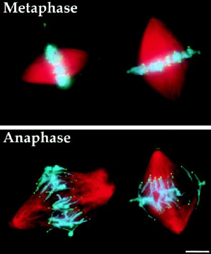 Figure 2. Immunofluorescence micrographs of fixed spindles showing that kinetochores lead chromosomes-to-pole movement during anaphase in Xenopus extract spindles. Spindle MTs are stained red using rhodamine tubulin, chromosomes are stained blue by DAPI and CENP-E is stained green using an anti– CENP-E primary and fluorescein-labeled secondary antibodies. Metaphase-arrested bipolar spindles with replicated chromosomes contained tight metaphase plates with sister kinetochores of bivalent chromosomes localized to the equatorial region of the spindle (top). Addition of a pulse of calcium to the extract inactivated the metaphase arrest and 8 min after calcium addition separated sister chromatids were seen moving poleward (bottom). Discrete foci of CENP-E are clearly visible at the leading edges of the poleward-migrating chromosomes. Bar, 10 μm.