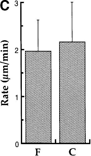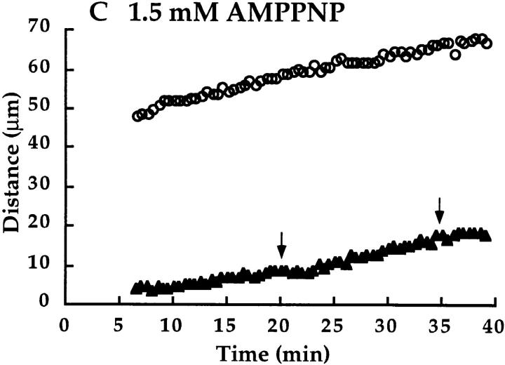 Figure 5. Anaphase kinetics of chromosome separation and spindle elongation in (A) control, (B) 1 μM taxol, and (C) 1.5 mM AMPPNP. Chromosome separation was measured as the distance (in μm) between the leading edges of separating sister chromatids as described (Murray et al., 1996). The arrows mark the region used to calculate the chromosome-to-pole movement rates after subtracting out the contribution from spindle elongation. Time 0 is when calcium was added to initiate anaphase. The rapid spindle elongation after chromosome separation in 1 μM taxol and the reduction in pole-to-pole distance after chromosome separation in the control sequence occur as a consequence of cytoplasmic flows in the extract moving the separated half spindles. There is no significant chromosome-to-pole movement in 1.5 mM AMPPNP for this particular spindle. These traces are for the sequences shown in Fig. 4 A.
