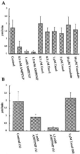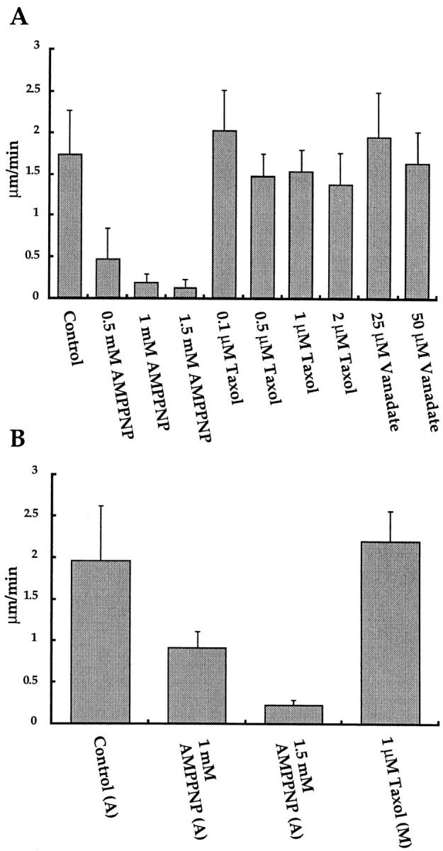 Figure 6. Summary of the analysis of the rates of chromosome-to-pole movement (A) and poleward MT flux (B) for the indicated treatments. The anaphase poleward MT flux value is replotted from Fig. 3 C. The experiments summarized here were performed on 13 different extract preparations. For the analysis of chromosome-to-pole movement a total of 65 sequences were acquired, of which 35 were analyzed to generate the data shown in A. Each condition represents analysis of chromosome movement on three to five spindles, with the exception of 25 μM vanadate (two spindles) and 2 μM taxol (two spindles). Multiple measurements were often performed on single spindles and the observed effects were qualitatively confirmed in both sequences that were not analyzed because of extensive flow-driven movements and fixed images acquired throughout the sample preparation at the end of each sequence. The flux measurements were made for six spindles in 1 mM AMPPNP, four spindles in 1.5 mM AMPPNP, and six spindles in 1 μM taxol. The analysis of the effect of AMPPNP on flux was done on anaphase (A) spindles whereas that of taxol on flux was done on metaphase (M) spindles.