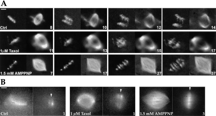 Figure 4. Pharmacological analysis of anaphase chromosome movement and poleward MT flux in Xenopus extract spindles. (A) Effect of taxol and AMPPNP treatments on chromosome movement and spindle structure during anaphase in vitro. Top row represents a control anaphase (Ctrl), the middle row represents anaphase in 1 μM taxol (1 μM Taxol), and the bottom row represents anaphase in 1.5 mM AMPPNP (1.5 mM AMPPNP). Taxol and AMPPNP were added along with the calcium used to initiate anaphase (t = 0 min). Each time point in the sequence is represented by paired DAPI-labeled chromosome (left) and X-rhodamine tubulin (right) images and the time after calcium addition is stamped in minutes on the lower right corner of the X-rhodamine tubulin image. Note both the much later times after calcium addition and the fivefold larger intervals (10 min vs. 2 min) between consecutive time points for the 1.5 mM AMPPNP sequence. The observed separation of sister chromatids in 1.5 mM AMPPNP is not due to chromosome-to-pole movement but primarily resulting from spindle elongation (see Fig. 5). (B) Effect of taxol and AMPPNP treatments on poleward MT flux. Paired X-rhodamine tubulin and fluorescein tubulin images are shown 1 min (for control and 1 μM taxol–treated spindles) and 3 min (for 1.5 mM AMPPNP–treated spindles) after the fluorescent mark was made on the spindle MTs. The initial position of the mark on the spindle is indicated by a white arrowhead. The 1 μM taxol spindle was marked 8 min after taxol addition. The 1.5 mM AMPPNP spindle was marked ∼10 min after addition of calcium and AMPPNP. Bar-splitting occurs as a result of poleward flux of MTs emanating from opposite spindle poles (Sawin and Mitchison, 1991). The similar extent of splitting of the initially central fluorescent mark is evident in both the control and taxol-treated spindles. Significant bar-splitting is not evident in the presence of 1.5 mM AMPPNP. Even at much later times (up to 10 min after marking the spindle), there is no significant bar-splitting at this AMPPNP concentration (see also Sawin and Mitchison, 1991). Bars: (A) 20 μM; (B) 10 μm.