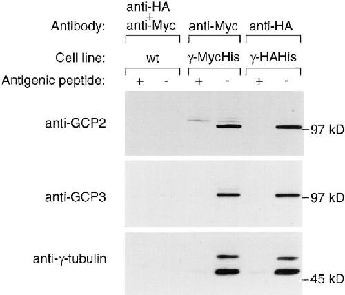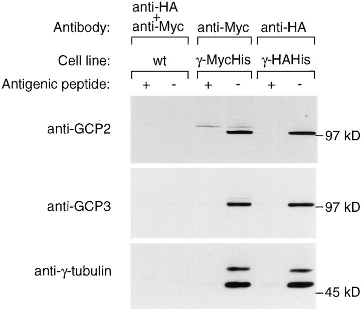 Figure 7. GCP2 and GCP3 are components of the cytoplasmic γ-tubulin complex. Epitope-tagged γ-tubulin was immunoprecipitated from cytoplasmic extracts of the indicated cell lines, with the indicated antibody in the presence or absence of competing antigenic peptide. Immunoprecipitates were immunoblotted with either anti–γ-tubulin, anti-hGCP2, or anti-hGCP3 antibodies. The positions of the 45- and 97-kD molecular weight markers are indicated.