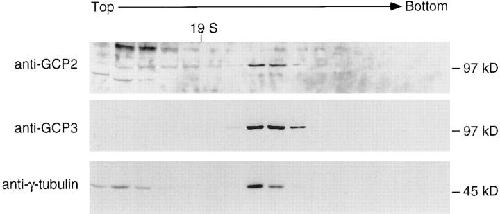 Figure 6. GCP2 and GCP3 cosediment with γ-tubulin in sucrose gradients. The sedimentation velocity of cytoplasmic γ-tubulin, GCP2, and GCP3 from human 293 cells was examined by sucrose gradient velocity sedimentation. Gradient fractions were immunoblotted with either anti–γ-tubulin, anti-hGCP2, or anti-hGCP3 antibodies. The position of thyroglobulin (19S) in a gradient run in parallel is indicated, as is the migration of the 45- and 97-kD molecular weight markers.