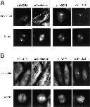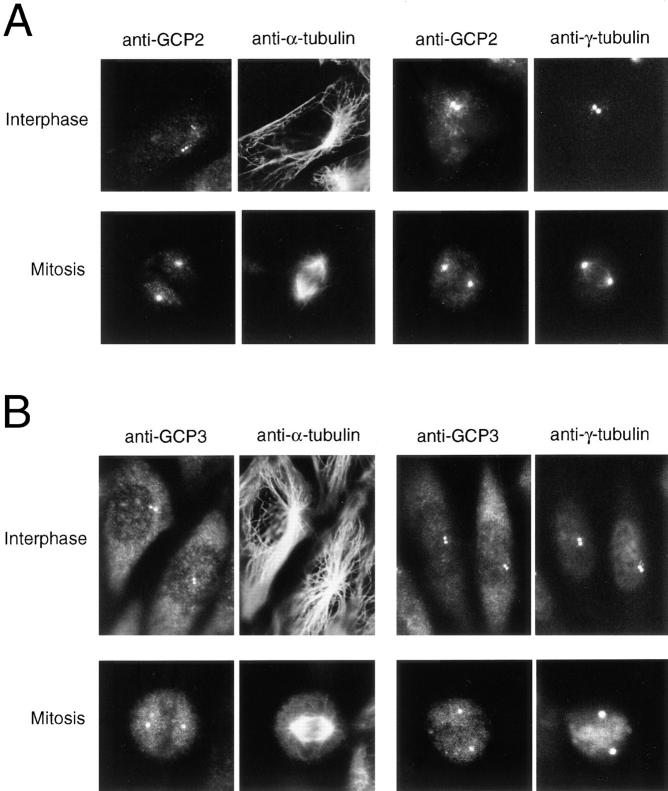 Figure 5. GCP2 and GCP3 are localized to the centrosome. (A) CHO cells were fixed and co-stained with anti-hGCP2 and either anti–α-tubulin or anti–γ-tubulin antibodies as indicated. (B) CHO cells were fixed and co-stained with anti-hGCP3 and either anti–α-tubulin or anti–γ-tubulin as indicated. Examples of cells in interphase and mitosis are shown.