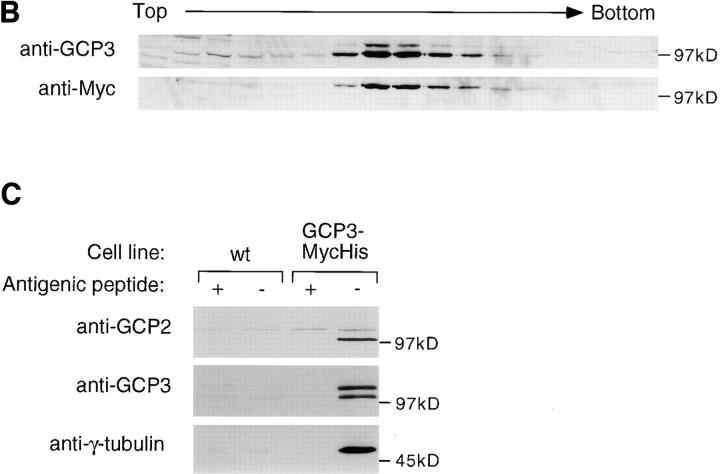 Figure 9. Epitope-tagged hGCP3 localizes to the centrosome and incorporates into the cytoplasmic γ-tubulin complex. (A) A31 cells stably expressing hGCP3MycHis were fixed and co-stained with anti-Myc and either anti–α-tubulin or anti–γ-tubulin, as indicated. Examples of both mitotic and interphase cells are shown. (B) Cell lysates made from A31-hGCP3MycHis were run on a sucrose gradient and fractions from this gradient were immunoblotted with anti-hGCP3 and anti-Myc antibodies. Note that epitope-tagged hGCP3 migrates more slowly than endogenous GCP3. (C) Cell lysates made from A31 or A31-hGCP3MycHis cells were subjected to immunoprecipitation with anti-Myc antibodies in the presence or absence of competing antigenic peptide. The resulting immunoprecipitates were analyzed on 7.5% SDS–polyacrylamide gels and immunoblotted with anti-hGCP2, anti-hGCP3, and anti–γ-tubulin as indicated. The positions of the 97- and 45-kD molecular weight markers are indicated.