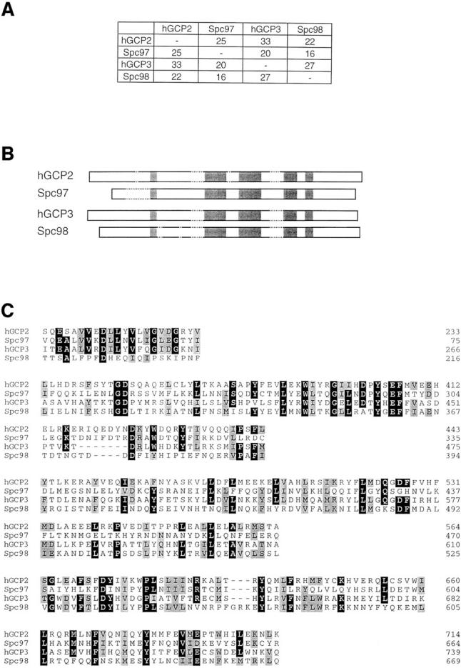Figure 4. hGCP3, Spc98p, hGCP2, and Spc97p are related proteins. (A) Pair-wise comparison of hGCP2, Spc97p, hGCP3, and Spc98p. The numbers represent the percent similarity using the following groupings of amino acids: N and Q; R and K; S and T; D and E; Y, F, and W; I, L, M, and V; H; P; C; G; and A. (B) A schematic diagram of the hGCP2, Spc97p, hGCP3, and Spc98p proteins. The boxes representing the proteins are drawn to scale, with the dashed segments representing gaps of 10 amino acids or more that were introduced to align the proteins. The shaded regions represent regions that show significant homology. (C) The amino acid sequences of the shaded regions of homology indicated in (B). Amino acid positions that are either identical (black shading) or similar (gray) in at least three of the proteins are indicated. These sequence data are available from GenBank/ EMBL/DDBJ under accession numbers AF042379 (hGCP2) and AF042378 (hGCP3).