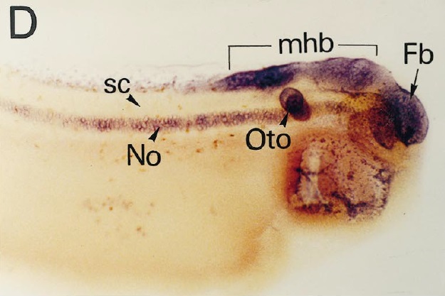 forebrain; mhb, mid-hindbrain; oto, otocyst;