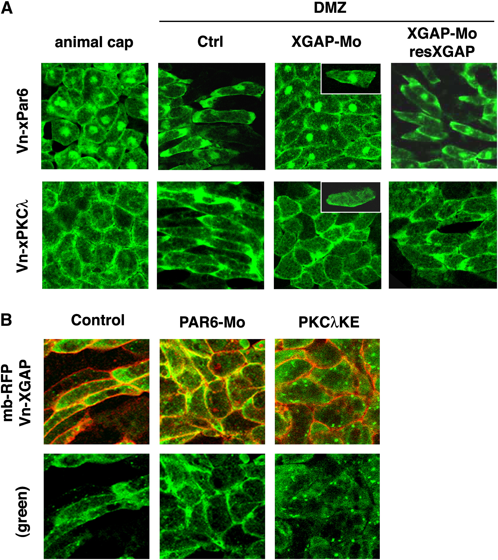 (B) xPAR-6 and xPKCλ are required for the polarized localization of XGAP. Venus-tagged XGAP was coinjected with xPAR-6 Mo or xPKCλKE and fated to DMZ. The membrane bound RFP was also injected to mark the cell membrane. The horizontal plane is the mediolateral axis. |