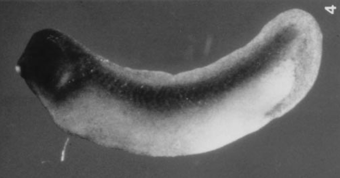 plug is totally negative. 2: Dorsal view of a neurula (St. 18) labelled with XL75 probe. XL75 mRNA is localized in the neurectoderm and neural