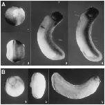XL75 probe (1), a neurula (St. 19) labelled with XL43 probe (2), and a tailbud stage (St. 33) hybridized with XL75 probe (3). Only background