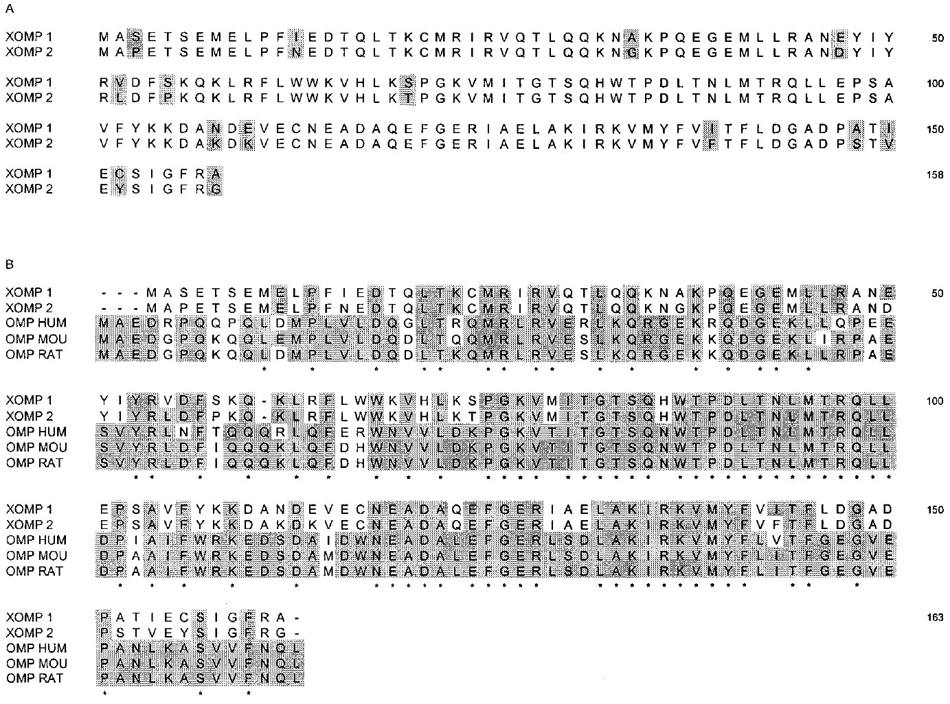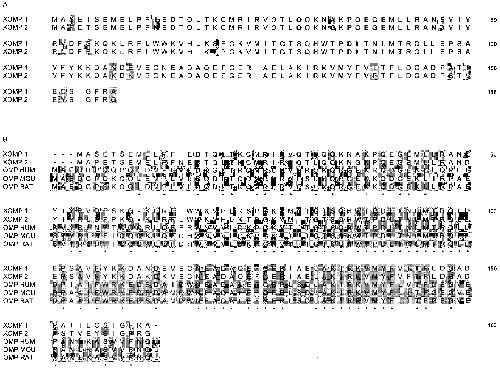 B: Alignment of Xenopus OMPs XOMP1 and XOMP2 with OMP